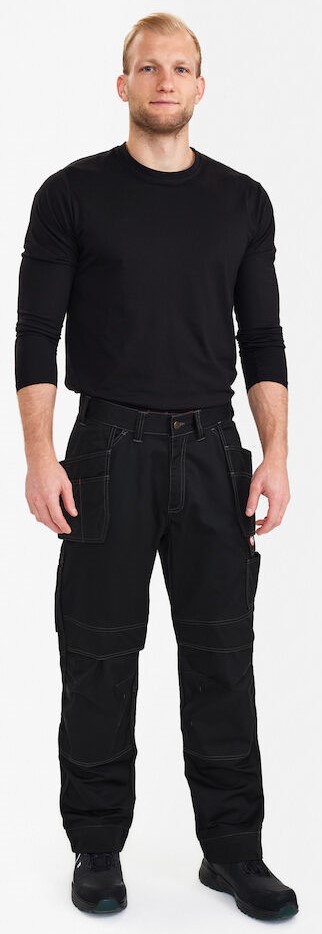 Funktionelle Handwerkerhose mit Kontraststeppnähten. Optimale Passform, ergonomisch geformte Knie. Zwei geräumige, schräg sitzende Einschubtaschen sowie zwei Holstertaschen vorne. Zwei Gesäßtaschen mit Patte. Schenkeltasche mit Patte sowie Einschüben für z. B. Stifte. Freihängende, verstärkte Zollstocktasche mit extra Fächern garantiert optimale Bewegungsfreiheit. Verstellbare Hammerschlaufe. Verstärkte Knietaschen mit zwei Einstellmöglichkeiten für Knieschutzkissen. Verstärkter Saum der Hosenbeine für extra hohe Verschleißfestigkeit. Gute Sichtbarkeit durch Reflexpaspeln mittig hinten auf den Hosenbeinen. Die Hose verfügt über einen extra breiten Hosenaufschlag, sodass sich bei Bedarf die Schrittlänge verlängern lässt. Für zusätzliche Beinlänge muss nur ein Saum aufgetrennt werden, dahinter verbirgt sich ein zusätzlicher Saum.