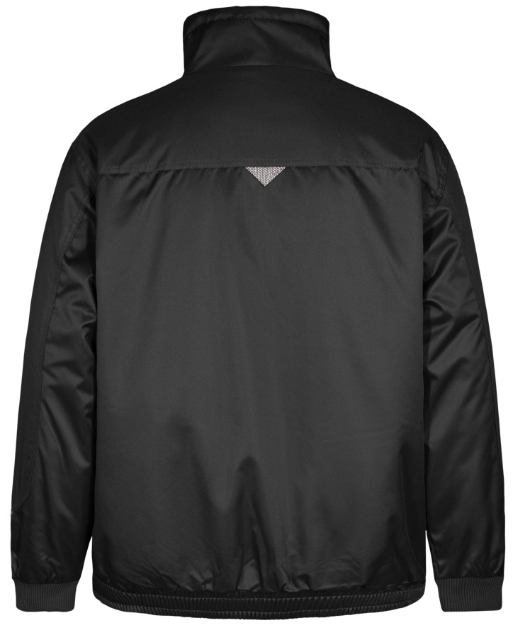 Pilotjacke mit doppelt verdecktem Kunststoffreißverschluss in passendem Farbdesign. Schultern und Ärmel verstärkt. Dunkel gefärbte Druckknöpfe. Brusttasche links mit seitlichem Eingriff mit Reißverschluss. Offene Brusttasche mit verschließbarer Handytasche rechts. Zwei Eingrifftaschen. Innentasche mit Reißverschluss. Strickbündchen an den Ärmeln. Elastischer Bund. Kragen mit Schnurstopper verstellbar. Faserpelz im Kragen und am Körper. Reißverschluss im hinteren, unteren Rückenbereich, um die Jacke für Transfers und Embleme leichter handhaben zu können. Wind- und wasserabweisendes Material.