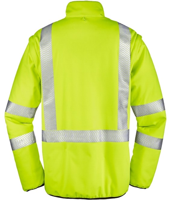 - Segmentierte, auflaminierte Reflexstreifen, umlaufend um Körper und Ärmel sowie über die Schulterpartien (Hosenträgerreflexstreifen)