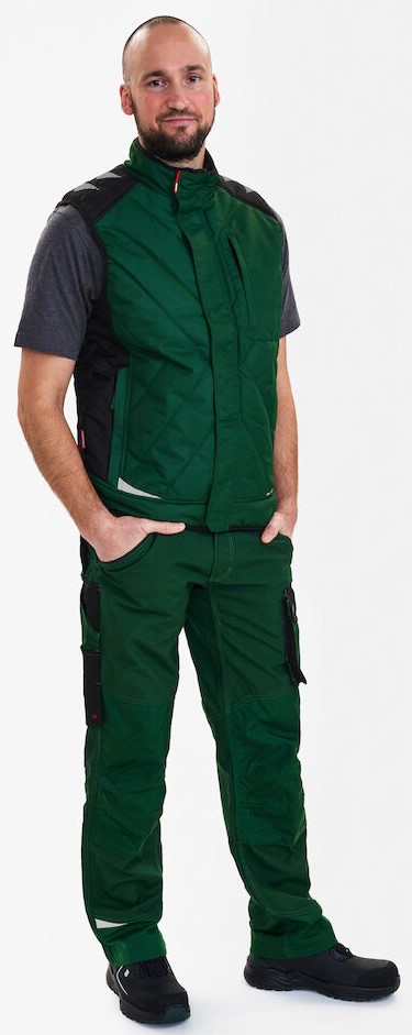 Warme Winterweste mit hohem Kragen und verlängerter Rückenpartie. Weiches Microfleece innen im Kragen. Frontreißverschluss. Zwei geräumige Einschubtaschen und eine Brusttasche, alle mit Reißverschluss. Innentasche ebenfalls mit Reißverschluss. Die Weste hat einen Gummizug in Bund und Armöffnungen, sodass weniger Wind eindringt.