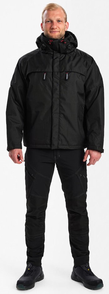Einfarbige, wasserdichte und atmungsaktive Winterjacke mit FE-TEX-Membrane und verschweißten Nähten. Mikrofleece innen im Kragen. Gestepptes Futter. Zwei Vordertaschen sowie zwei Brusttaschen mit Reißverschluss. Geräumige Innentasche links. Innenfach fürs Handy sowie Öffnung und Schlaufe für Handy oder MP3-Player. Verlängerter Rücken und verstellbarer Bund. Abnehmbare Kapuze. Verstellbare Ärmelbündchen mit Windschutz.