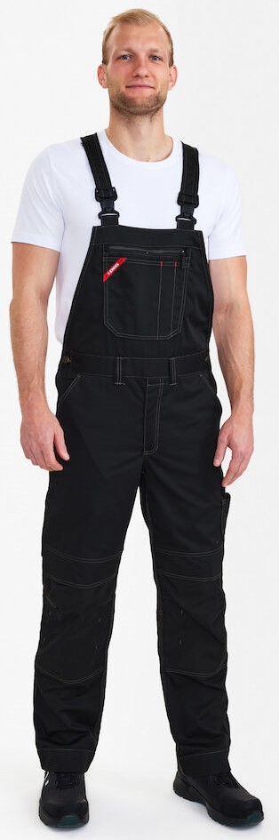Funktionelle Latzhose mit Kontraststeppnähten. Hochgeschnittener Rückenbereich mit breitem Gummizug und verstellbaren Trägern. Brusttasche mit Fächern für Stifte sowie Brusttasche mit Reißverschluss. Optimale Passform, ergonomisch geformte Knie. Verstellbare Bundweite. Zwei geräumige, schräg sitzende Einschubtaschen vorne. Zwei Gesäßtaschen mit Patte. Schenkeltasche mit Patte sowie Einschüben für z. B. Stifte. Freihängende, verstärkte Zollstocktasche mit extra Fächern garantiert optimale Bewegungsfreiheit. Einstellbare Hammerschlaufe. Verstärkte Knietasche mit zwei Einstellmöglichkeiten für Knieschutzkissen. Verstärkter Saum der Hosenbeine für extra hohe Verschleißfestigkeit. Gute Sichtbarkeit durch Reflexpaspeln mittig hinten auf den Hosenbeinen. Die Hosenbeine verfügen über einen extra breiten Hosenaufschlag, sodass sich bei Bedarf die Schrittlänge verlängern lässt. Für extra lange Beinlänge bloß einen Saum öffnen, dahinter verbirgt sich ein zusätzlicher Saum.