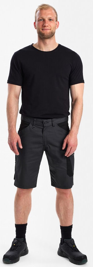Zweifarbige Shorts mit modernem Schnitt, bei denen viel Wert auf eine gute Passform gelegt wurde. Die Shorts sind aus einem Stoff gefertigt, der angenehm zu tragen ist. Die Shorts haben einen praktischen Gummizug hinten in der Taille, der für eine gute Passform sorgt und dafür, dass bei sich wiederholenden Bewegungen nichts verrutscht. Bei der Entwicklung der Shorts wurde der Schwerpunkt auf die Industrie gelegt. Sie verfügen über alle notwendigen funktionellen Details und sind auch für Fahrer, Lagermitarbeiter oder ähnliche Arbeitsfunktionen geeignet. Die Shorts haben besonders viele funktionelle Taschen wie beispielsweise zwei geräumige schräge Taschen vorne. Gesäßtasche mit Klettverschluss. Auf der linken Seite befindet sich eine Schenkeltasche mit Patte und separater Handytasche, auf der rechten Seite eine Zollstocktasche mit einem lose hängenden Boden und Verstärkung. Für mehr Sichtbarkeit und Sicherheit haben die Shorts reflektierende Details vorne und hinten.