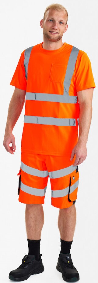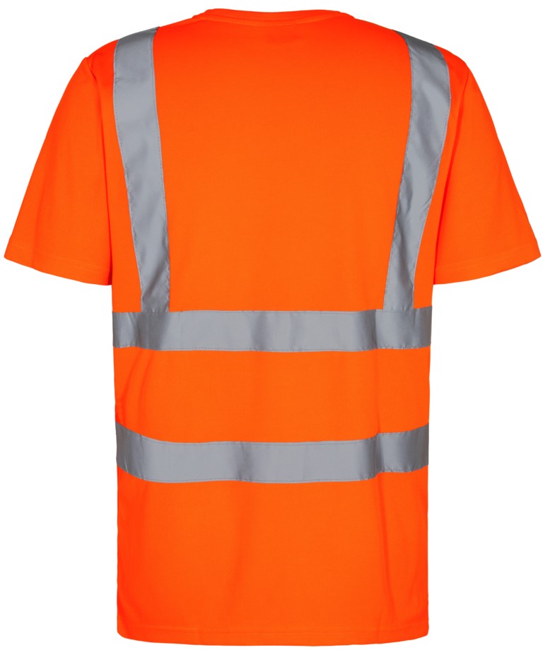 Bequemes und schickes, fluoreszierendes T-Shirt aus leichtem Material. Rippstrick am Hals sowie Tasche auf der linken Brustseite. Aufgenähte Reflexstreifen über die Schulterpartie hinweg sowie rund um die Taille. Mit Brusttasche. Bekleidungsklasse 2. Getestet nach 25 Wäschen.