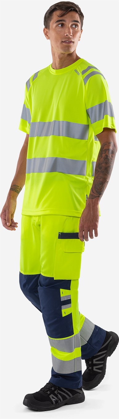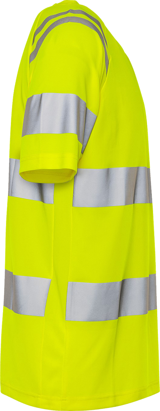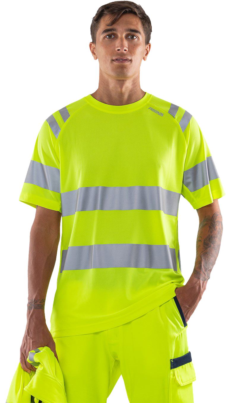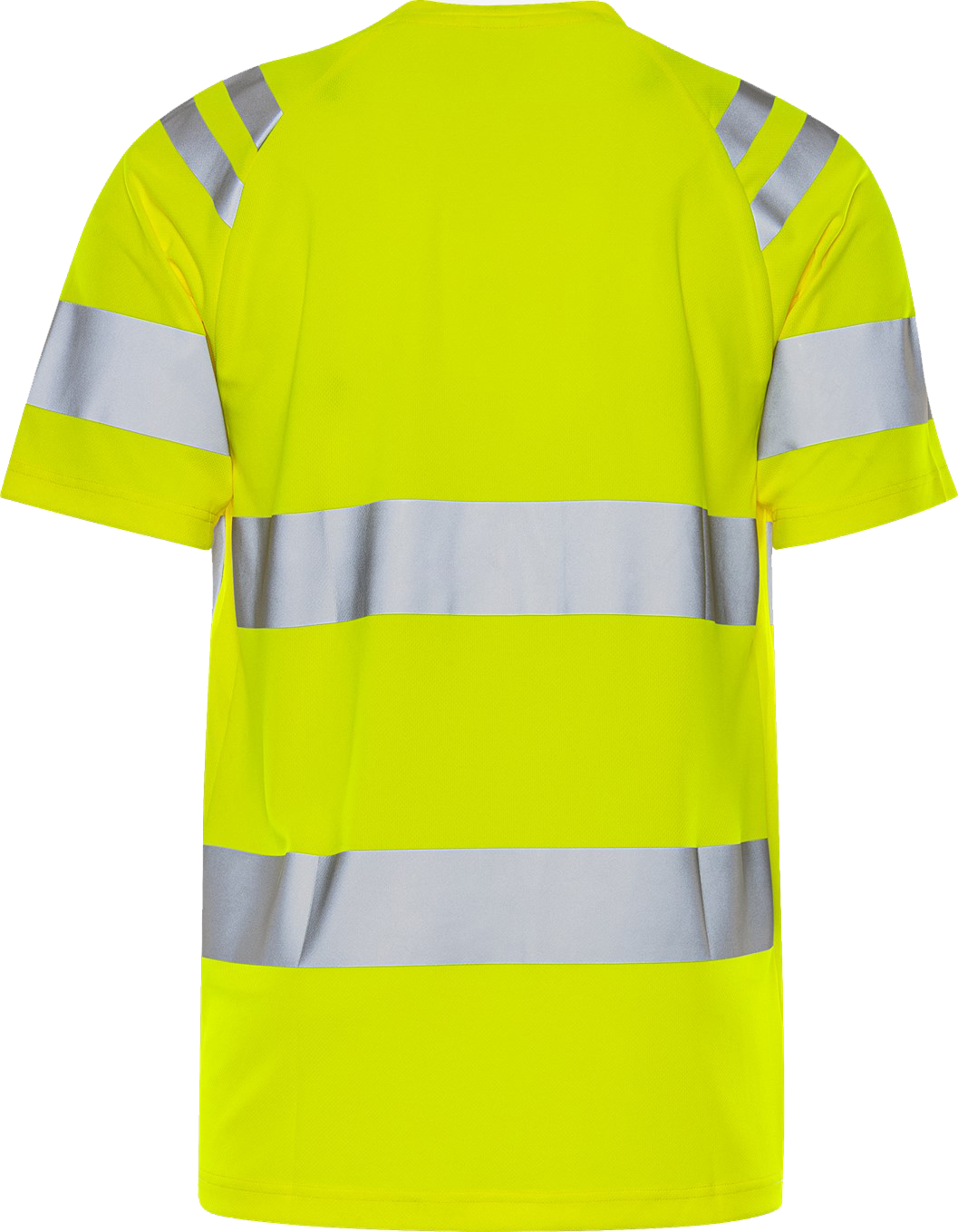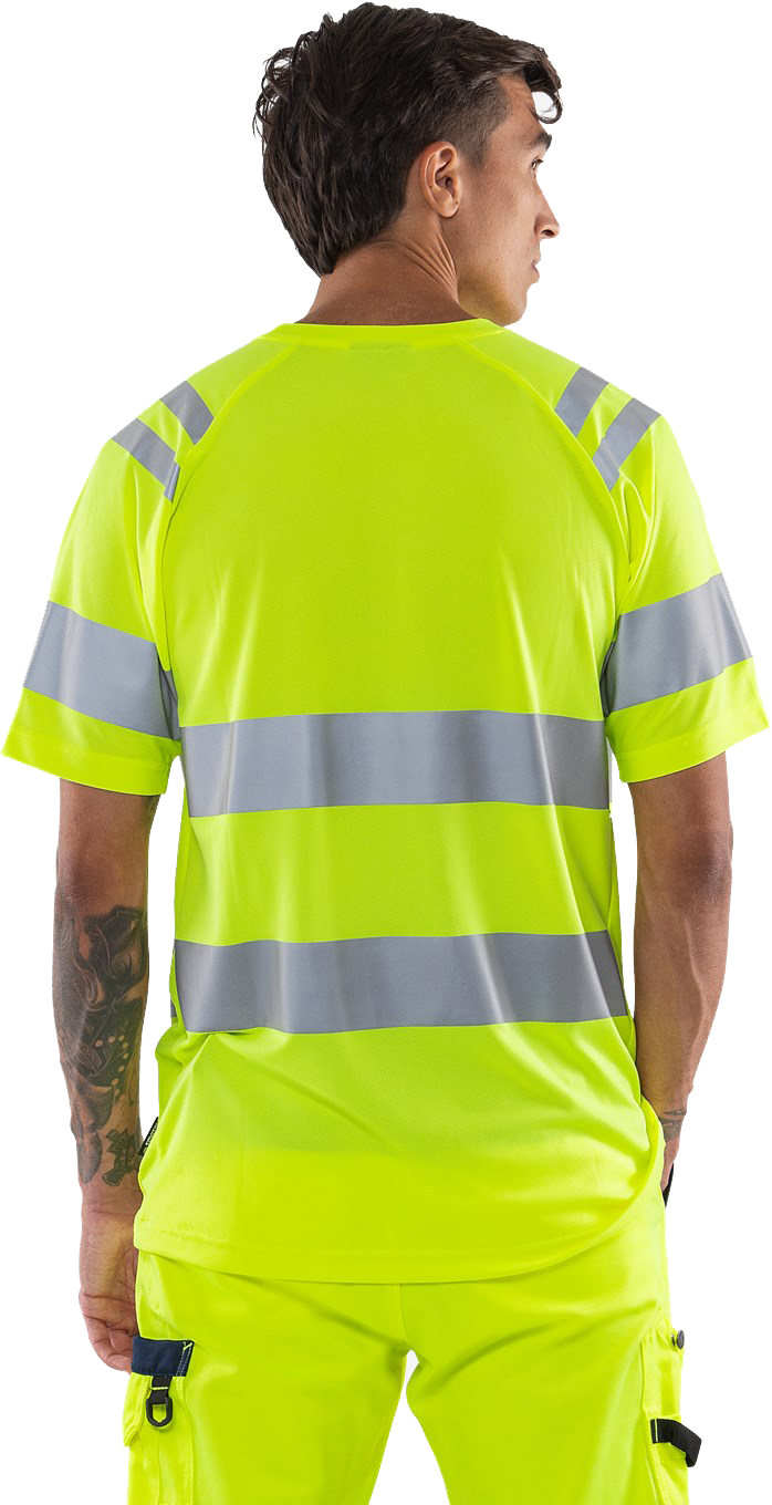 Warnschutz-T-Shirt aus recyceltem Material in einem Funktionsstrick für bessere Atmungsaktivität. Dieses leichte und luftige T-Shirt ist eine gute Wahl für warme Arbeitstage. Konzept: Trofta