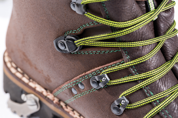 Das 4-5mm starke Schweizer Juchtenleder ist wasserdicht, dampfoffen und nahezu unverwüstlich. Dieser Schuh wurde aus zwei Stücken bestem Leder zusammengesetzt und an der Mittelnaht zusätzlich noch durch zwei Nieten verstärkt. Der komplette Schaft des Schuhes wurde mit einer Dreifachnaht stabil auf die Sohle genäht. Das Innenfutter besteht aus einem temperaturregulierenden Distanzgewebe, welches Feuchtigkeit und Wärme aus dem Schuh pumpt. Schuhösen mit Kugellager schützen den Schnürsenkel bei täglichem tragen vor Verschleiß. Die Stoßabsorbierende Sohle besitzt einen Klappgriff der besseren Halt in steilem Gelände oder gefrorenem Holz gibt.