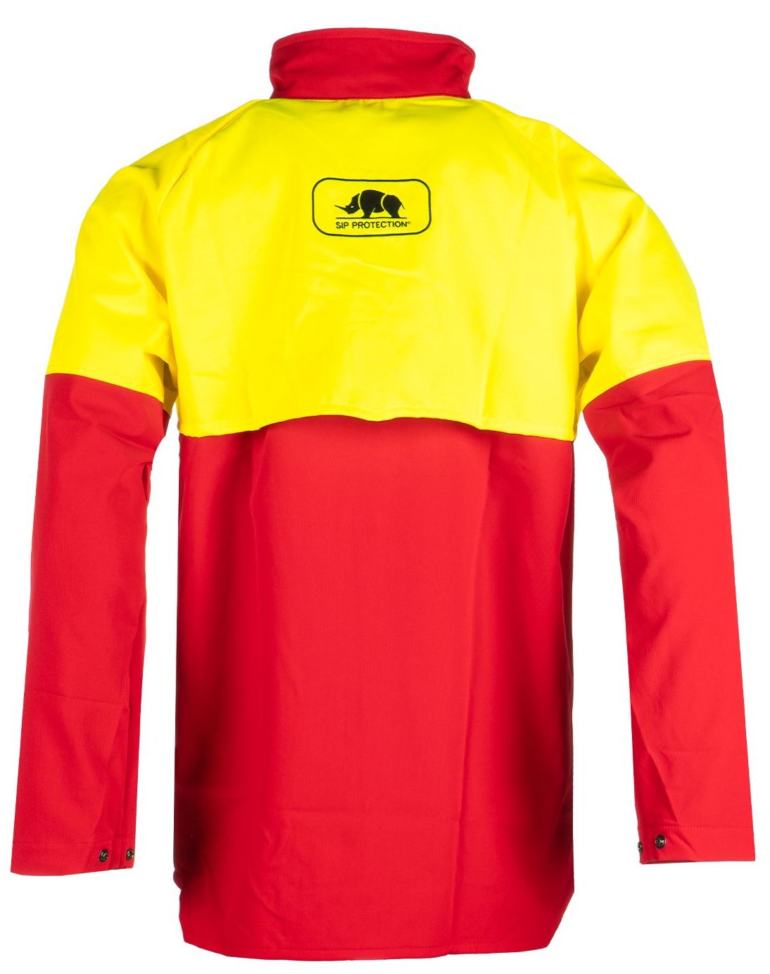 Passende Jacke zur Flex 1XSP Kettensägenschutzhose. Aufgrund ihrer roten und gelben fluoreszierenden Oberfläche auf Entfernung gut sichtbar.