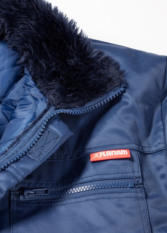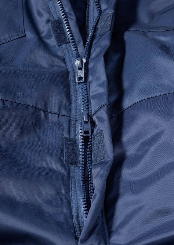 Wasserabweisend, seitlicher Reißverschluss am Unterschenkel, 2 Brusttaschen mit Reißverschluss, 2 Beuteltaschen, Frontreißverschluss mit Patte und 2-Wege-Reißverschluss, Webpelz im Kragen, Maßstabtasche, 1 Gesäßtasche mit Patte.