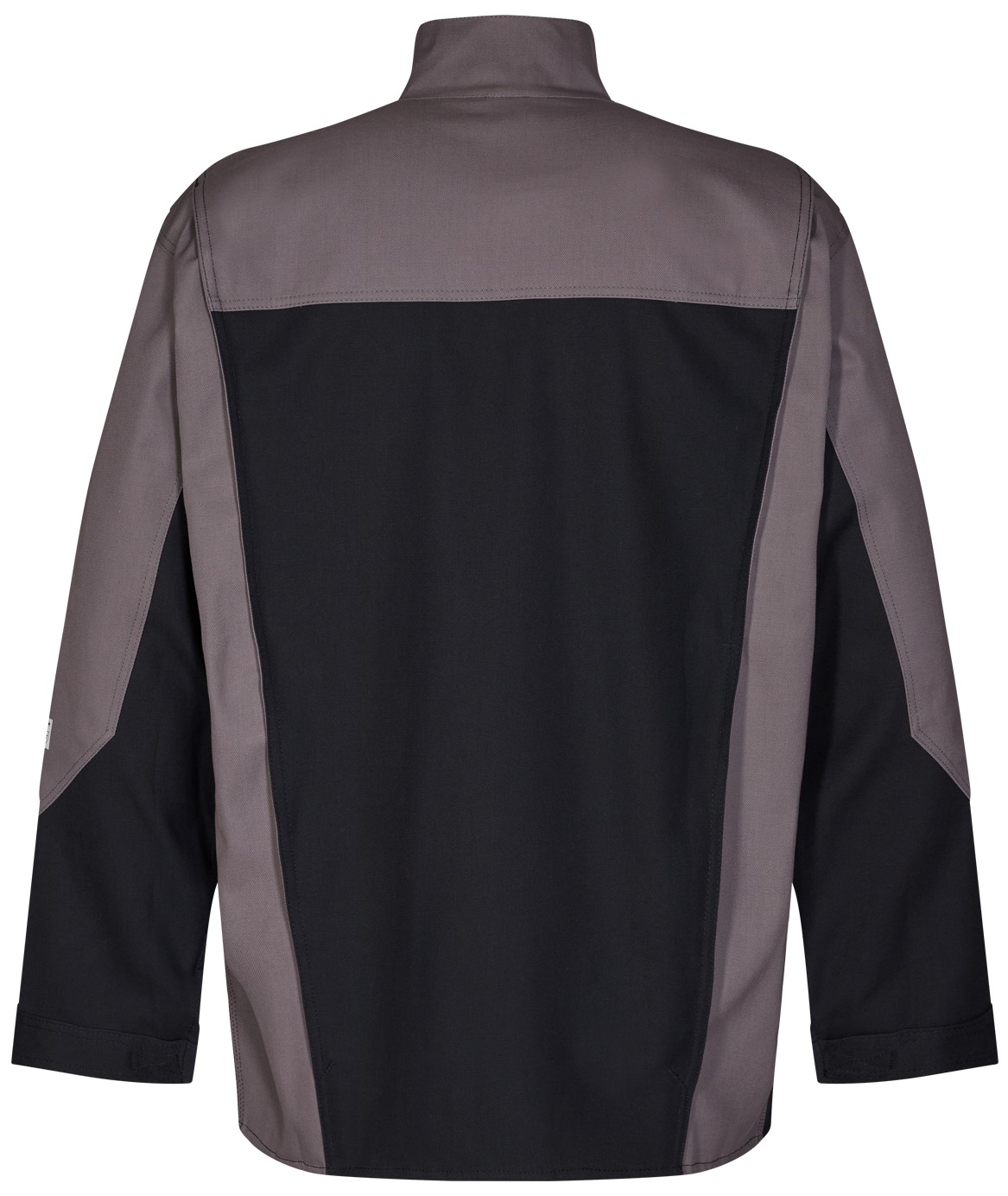 Jacke mit doppelter Knopfleiste und verdeckten Druckknöpfen vorne. Brusttaschen mit Patte und Klettverschluss, die Rechte mit Handytasche, zwei Innentaschen mit Reißverschluss, zwei Seitentaschen mit Patte und Klettverschluss, Manschetten mit Klettverschluss. Eine Rückenfalte sorgt für bessere Bewegungsfreiheit. Funktionelle Details bei Taschen und Bund verhindern das Festsetzen der Funken. Antistatisch, flammhemmend und schützend vor Aerosolen, Spray und leichten Spritzern von Chemikalien.