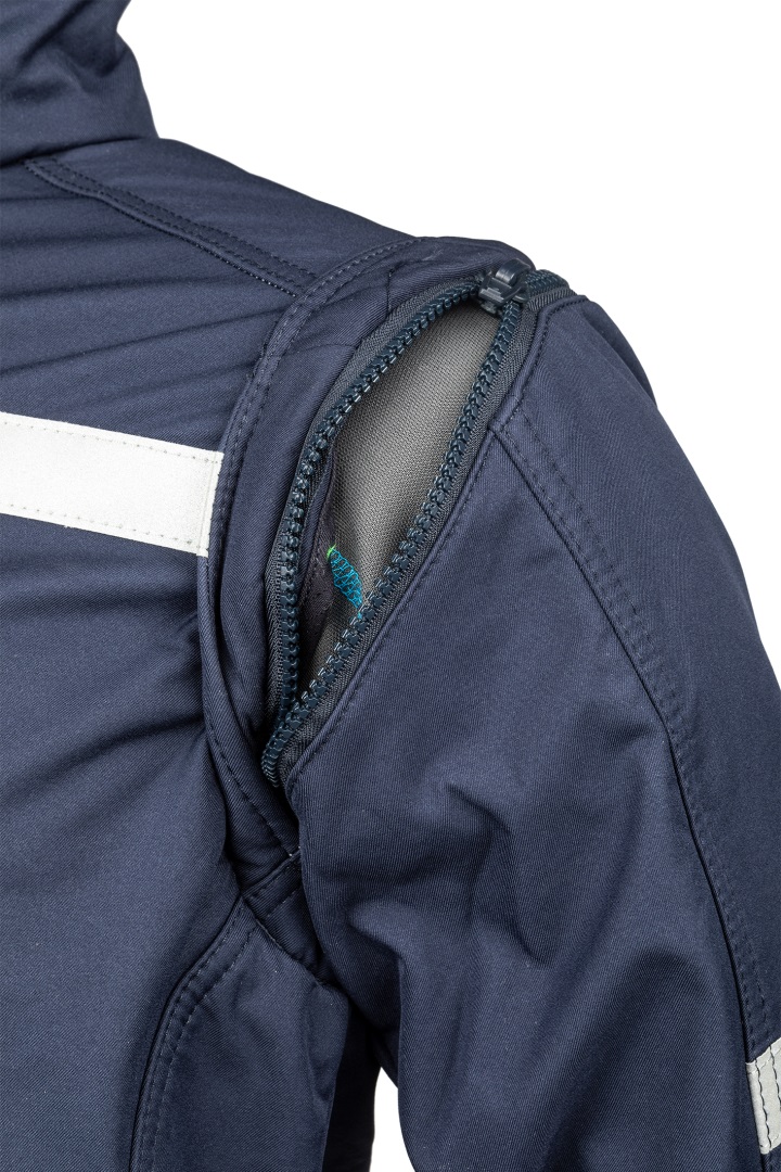 - Gewebe: 3-Lagen Softshell: Polyester-Gewebe + atmungsaktive FR PU-Beschichtung + inhärent FR Fleece + AST; ± 350 g/m²