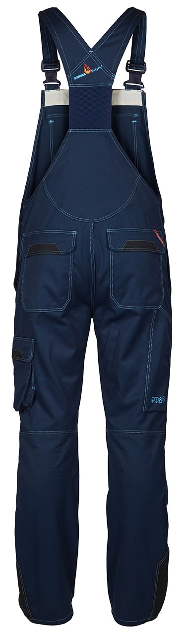 Latzhose mit elastischem Rückenteil und verstellbaren Trägern. Außentasche mit Patte und Klettverschluss. Auf der Außentasche befindet sich eine weitere verdeckte Reißverschlusstasche. Zwei Einschubtaschen. Zwei Gesäßtaschen mit Patte und Klettverschluss. Zollstocktasche. Schenkeltasche mit Innenschlaufe mit D-Ring (vorne) zur Befestigung einer ID-Karte. Die Schenkeltasche ist sehr geräumig und sorgt dank des freihängenden Bodens für uneingeschränkte Bewegungsfreiheit. Ergonomisch geformte Knie. Knieverstärkung/Knietaschen, unten mit Klettver-schluss. Antistatisch und flammhemmend. Für Industriewäsche geeignet.