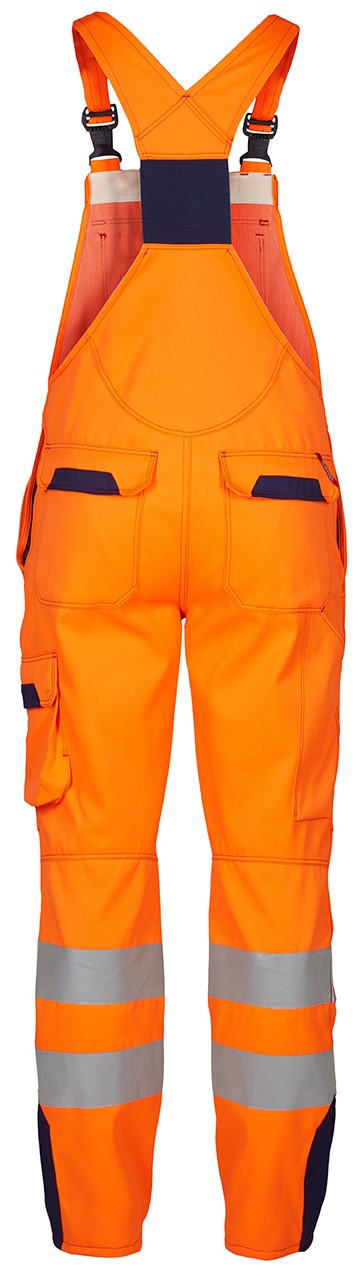 Latzhose mit elastischem Rückenteil und verstellbaren Trägern. Außentasche mit Patte und Klettverschluss. Auf der Außentasche befindet sich eine weitere verdeckte Reißverschlusstasche. Zwei Einschubtaschen. Zwei Gesäßtaschen mit Patte und Klettverschluss. Zollstocktasche. Schenkeltasche mit Innenschlaufe mit D-Ring (vorne) zur Befestigung einer ID-Karte. Die Schenkeltasche ist sehr geräumig und sorgt dank des freihängenden Bodens für uneingeschränkte Bewegungsfreiheit. Ergonomisch geformte Knie. Knieverstärkung/Knietaschen, unten mit Klettverschluss. Flammhemmende LOXY® Reflexstreifen. Antistatisch und flammhemmend. Bekleidungsklasse 2.