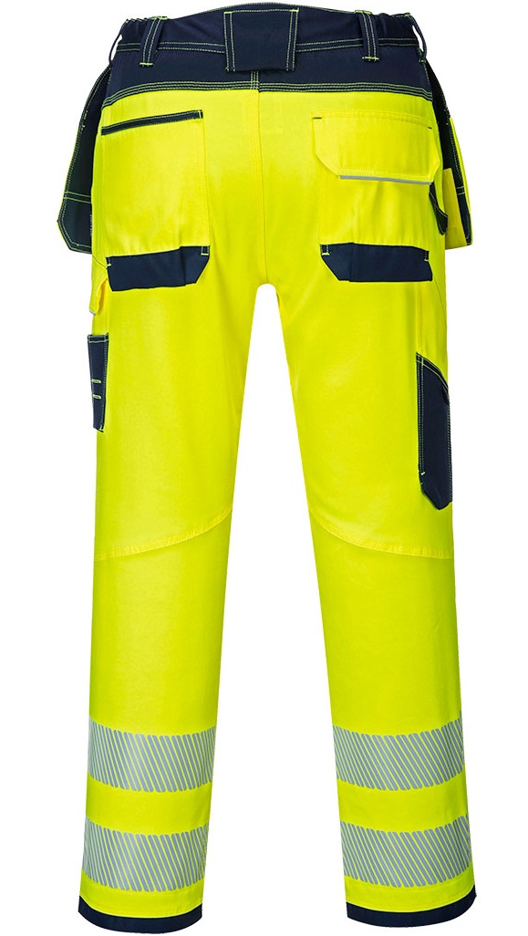 Eine durchdachte, innovative Warnschutzhose mit multifunktionalen Holstertaschen, Knieschpolstertaschen und bequemen Zugriff auf mehrere Oberschenkeltaschen für die sichere Aufbewahrung von Mobiltelefon, Schlüsseln und Werkzeug. Oxford Gewebeverstärkung an den Belastungspunkten und dreifache Nähte garantieren maximale Haltbarkeit.