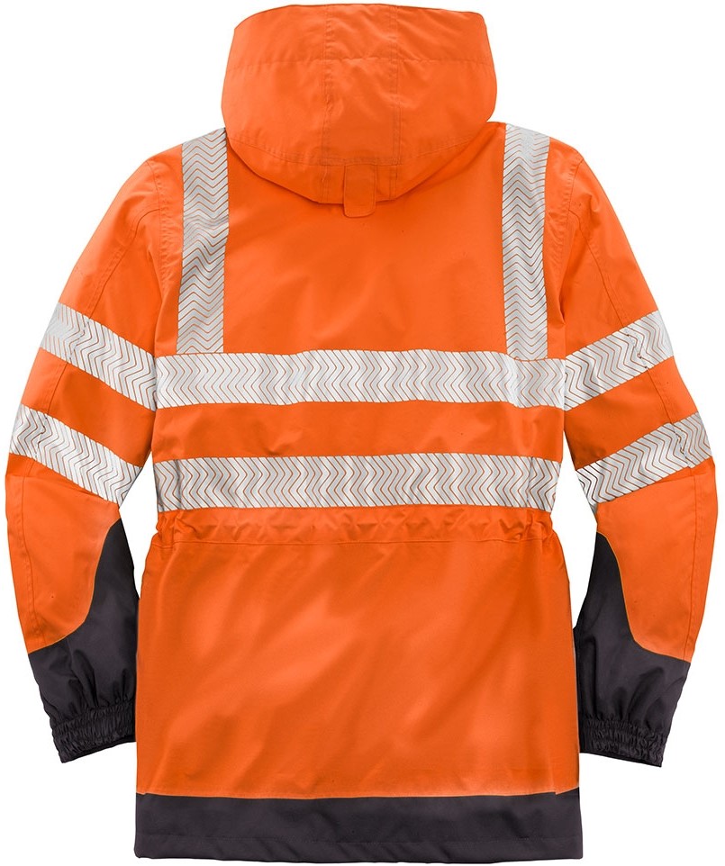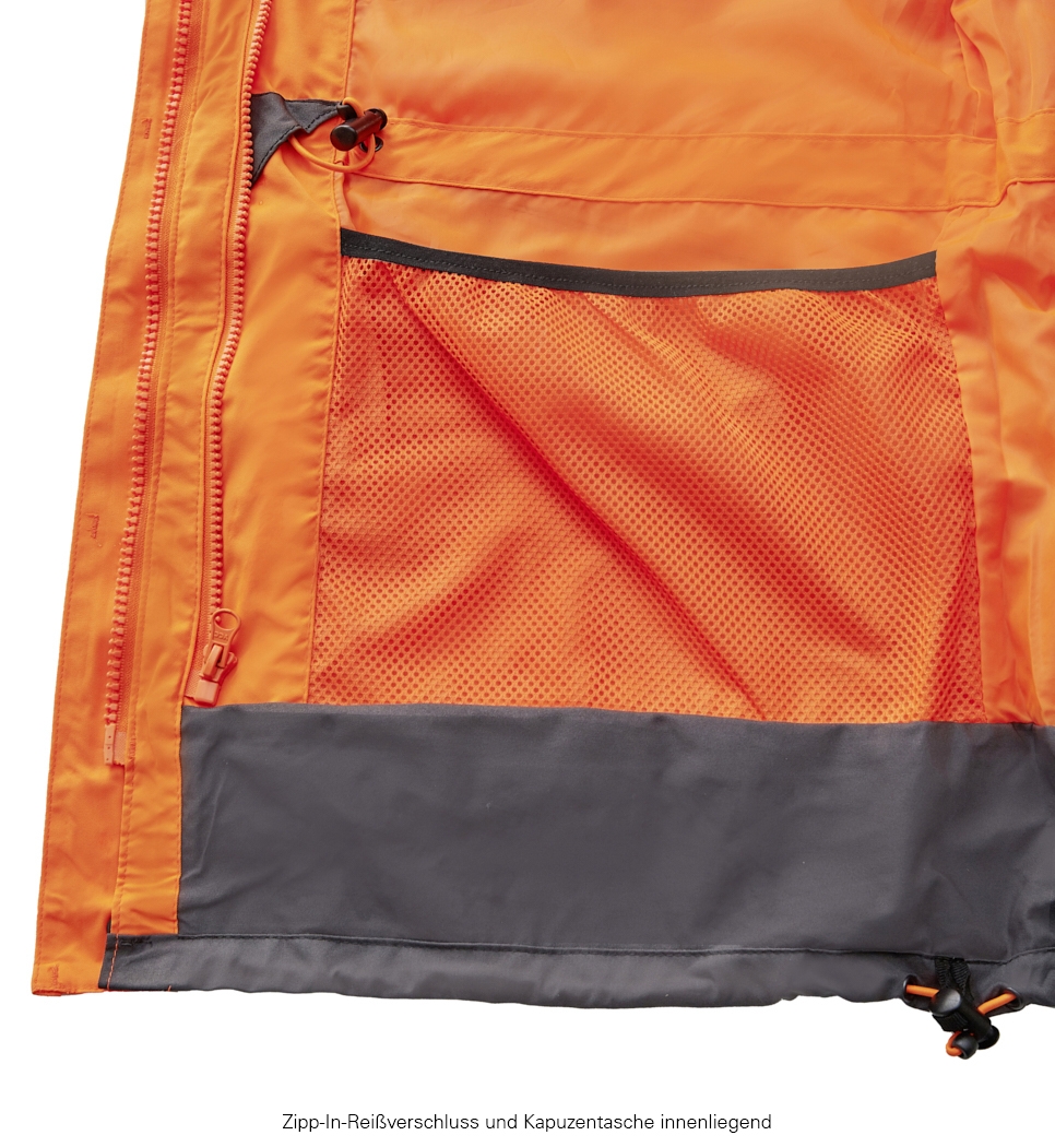 Funktionalität trifft Design. Einsetzbar bei Gefahren durch schlechte Sicht schützt TAMPA mit wind- und wasserdichter Ausstattung auch vor schlechtem Wetter. Unterstützt wird dies durch funktionelle Details, wie einem doppelt abgedecktem Front-Reißverschluss, eine abzippbare Sturmkapuze mit diversen Verstelloptionen sowie der Möglichkeit diverse Jacken/Weste aus dem 4PROTECT®-Programm einzuzippen. Eine hohe Atmungsaktivität gestattet zudem eine lange Tragedauer. Der dunkel abgesetzte Saum- und Manschettenbereich als Schutz vor schneller Verschmutzung sowie eine abnehmbare ID-Tasche zeugen von einer durchdachten Funktionalität. Zudem bietet TAMPA durch einen Service Reißverschluss die unkomplizierte Möglichkeit der Bedruckung in unterschiedlichen Formaten (z.B. 110 x 70 mm Brust und 260 x 100 mm Rücken), ohne einen abwertenden Einfluss auf die Warnschutz-Klassifizierung.