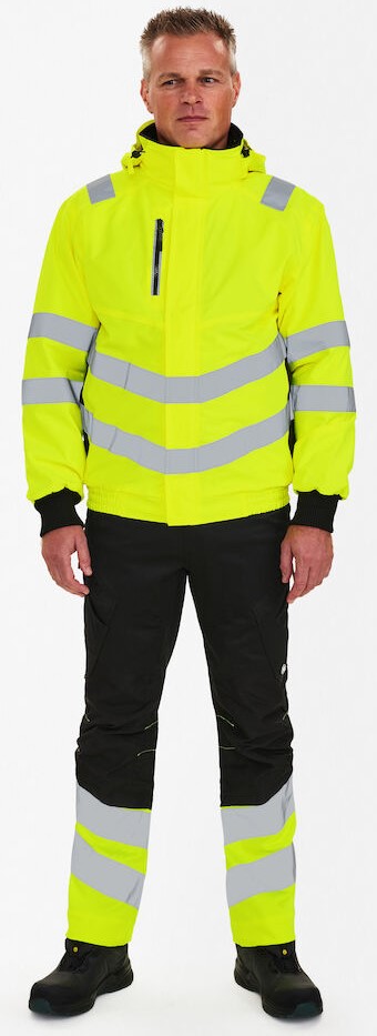 Fluoreszierende, atmungsaktive sowie wasser- und winddichte Pilotjacke mit verschweißten Nähten und im modernen Design. Doppelte Knopfleiste mit Reißverschluss sowie Klettverschluss vorne. Zwei geräumige Seitentaschen sowie Brusttasche mit Reißverschluss. Zwei Innentaschen, eine davon mit Reißverschluss. Abnehmbare, verstellbare Kapuze mit ausreichend Platz für den Arbeitshelm. Elastischer Saum unten und Rippstrick am Ärmelabschluss. Reißverschluss im Futter, der sich für Aufdruck/Stickerei eignet. Reflexstreifen über die Schulterpartie hinweg sowie rund um Ärmel und Körper. Bekleidungsklasse 3. Nach 50 mal Waschen getestet.