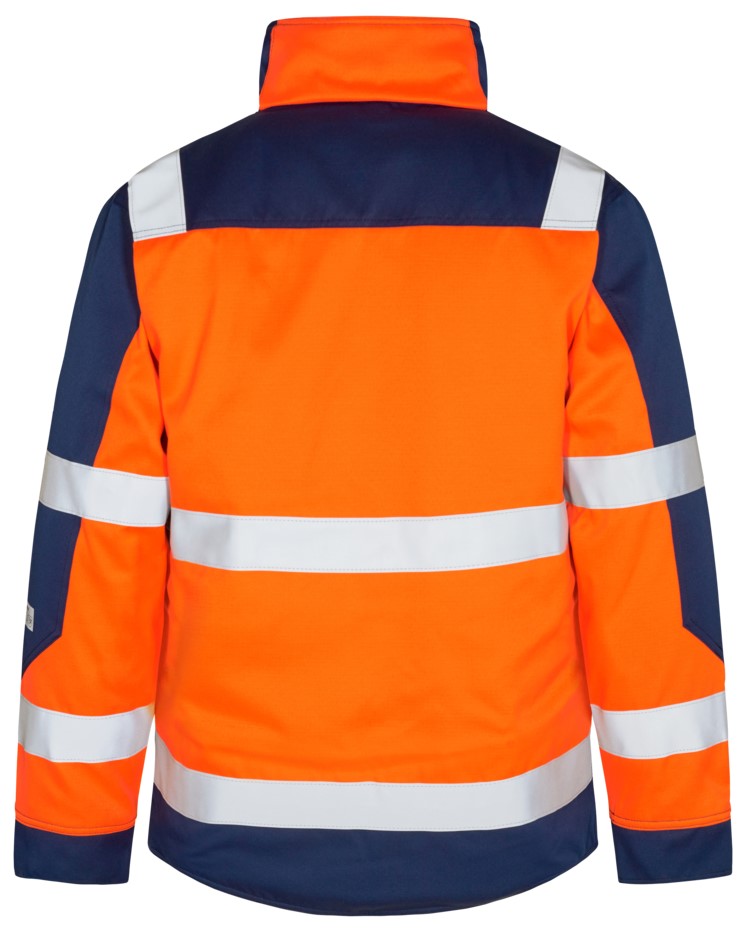 Winterjacke mit doppelter Knopfleiste, verdeckten Druckknöpfen und Metallreißverschluss vorne. Brusttaschen mit Patte und Klettverschluss, beide mit Handytasche. Zwei Innentaschen mit Reißverschluss. Zwei Seitentaschen mit Patte und Klettverschluss. Die Jacke ist mit flammhemmendem Steppfutter, flammhemmenden Reflektorstreifen sowie einer Membran ausgestattet, die Wasserdurchtritt verhindert. Praktische Details an Taschen und Nähten verhindern, dass Funken hängen bleiben. Antistatisch und flammhemmend.