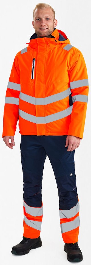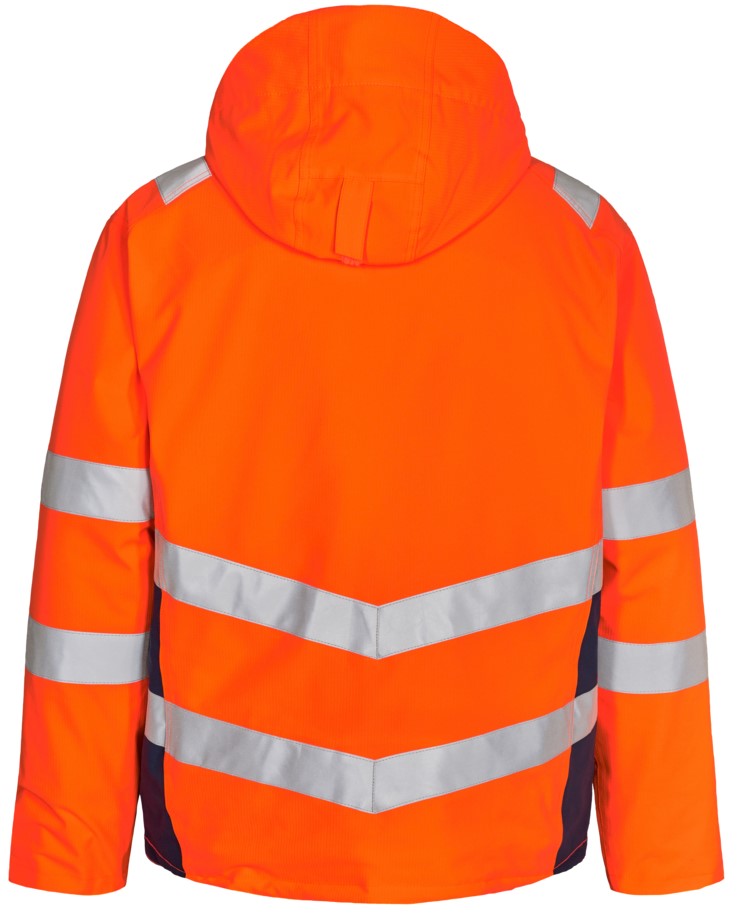 Atmungsaktive, wasser- und winddichte Winterjacke mit verschweißten Nähten und im modernen Design. Die Jacke hat einen hohen Kragen und ist hinten länger geschnitten. Doppelte Knopfleiste mit Reißverschluss sowie Klettverschluss vorne. Geräumige Seitentaschen, Brusttasche und Innentasche, alle mit Reißverschluss. Abnehmbare, verstellbare Kapuze mit ausreichend Platz für den Arbeitshelm. Verstellbarer Windfang unten, der Wind und Wetter abhält. Rippstrick an Ärmelabschluss und Kragen schützt vor Zugluft. Reißverschluss im Futter, der sich für Aufdruck/Stickerei eignet. Reflexstreifen über die Schulterpartie hinweg sowie rund um Ärmel und Taillen. Bekleidungsklasse 3. Nach 50 mal Waschen getestet.