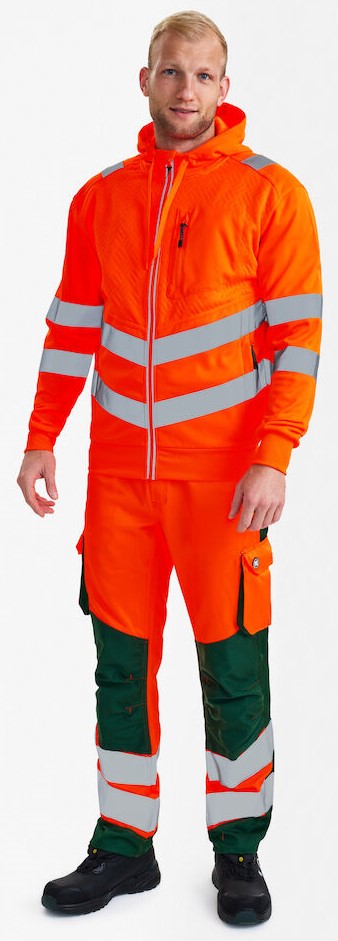 Funktionelle, fluoreszierende Sweatcardigan im modernen, attraktiven Design mit Stretchfutter. Leicht angerauter Innenseite, was den Stoff weich und angenehm macht. Reflektierender Reißverschluss vorne. Zwei geräumige Seitentaschen sowie eine Brusttasche, jeweils mit Reißverschluss. Die Sweat-Cardigan hat eine Waffelstruktur auf Vorderseite und Kapuze. Rippstrick an Ärmeln und Saum unten. Dehnbare Reflexstreifen über die Schulterpartie hinweg sowie rund um Ärmel und Taille. Bekleidungsklasse 2. Nach 25 mal Waschen getestet.
