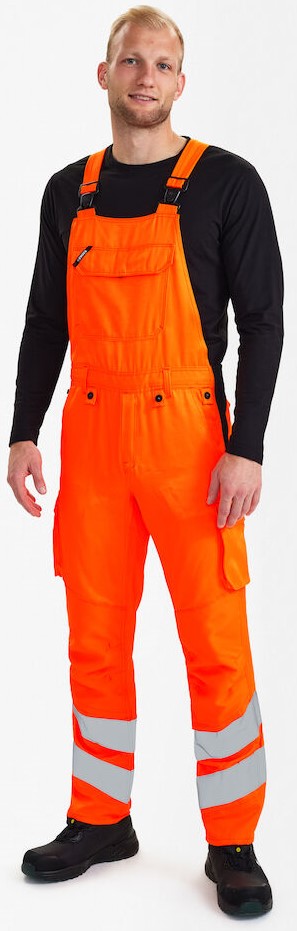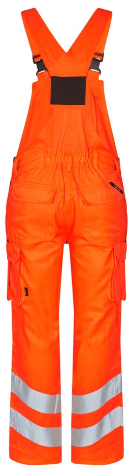 Funktionelle, und fluoreszierende Latzhose im modernen Design. Optimale Passform mit u. a. ergonomisch geformtem Kniebereich. Der Stoff ist strapazierfähig und atmungsaktiv und besteht zu 50% aus, recyceltem Polyester.. Der elastische Taillenbund hinten sorgt für eine gute Passform und einen sicheren Sitz der Latzhose. D-Ring am Latz für die Befestigung von z. B. Ausweisen. Hoch geschnittenes Rückenteil und Rippstrickeinsätze an den Seiten sorgen für optimale Passform und viel Tragekomfort. Verstellbare Träger. Latztasche mit Taschenklappe und Klettverschluss. Die Latztasche hat innen eine Reißverschlusstasche. Zwei Schenkeltaschen mit Klettverschluss. Die linke Schenkeltasche hat eine zusätzliche Handytasche sowie eine Innentasche, z. B. für das Walkie-Talkie. Die rechte Schenkeltasche hat eine Innentasche für z. B. den Zollstock. Knieverstärkung/Knietasche mit Klettverschluss unten und besteht aus CORDURA®-Material. Reflexstreifen am Unterschenkel. Bekleidungsklasse 2. Nach 50 mal Waschen getestet.
