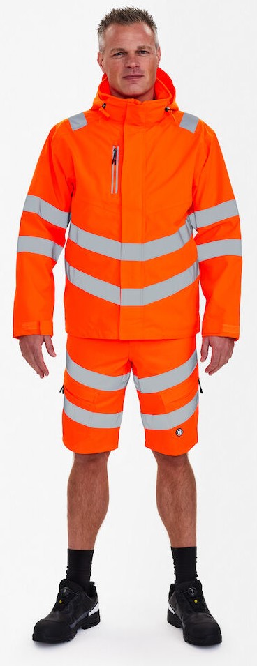 Fluoreszierende, atmungsaktive sowie wasser- und winddichte Shelljacke mit verschweißten Nähten und hohem Kragen im modernen Design. Doppelte Knopfleiste mit Reißverschluss sowie Klettverschluss vorne. Die Jacke kann mit den Modellen 1192-236, 1159-158 und 5159-158 kombiniert werden, die alle einen Reißverschluss zum Einzippen haben. Zwei geräumige Seitentaschen und Brusttasche mit Reißverschluss sowie große Innentaschen mit Klettverschluss. Abnehmbare, verstellbare Kapuze mit ausreichend Platz für den Arbeitshelm. Verstellbare Manschetten. Reißverschluss im Futter, für Aufdruck/Stickerei eignet. Reflexstreifen über die Schulterpartie hinweg sowie rund um Ärmel und Körper. Bekleidungsklasse 3. Nach 50 mal Waschen getestet.