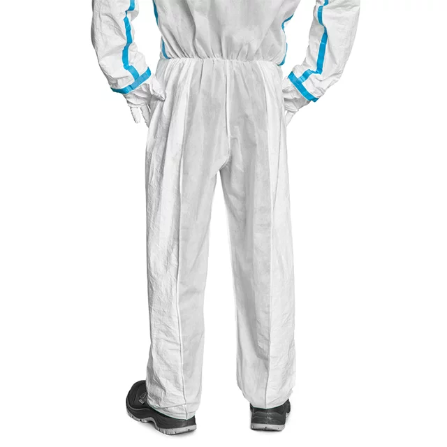 - Design: Anzug mit Kapuze und angearbeiteten Tyvek® Innenhandschuhen und angearbeiteten Tyvek® Socken, Vorderseite aus Tyvek®, Rückseite aus SMS