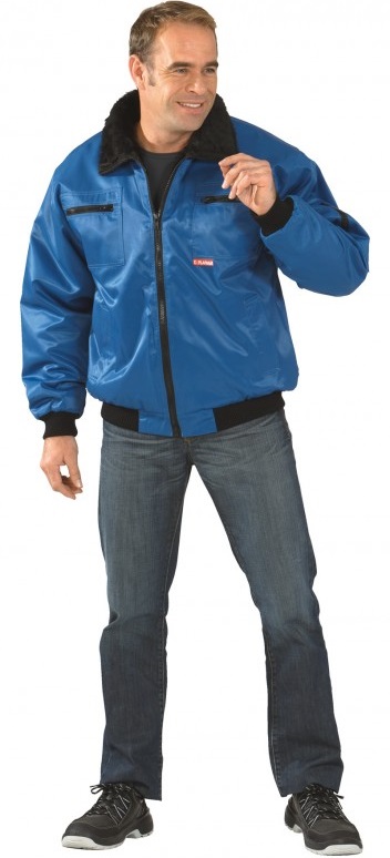 Cold protective clothing according to DIN EN 342, water-repellent, 2 side pockets, 2 breast pockets with zip, knitted cuffs on sleeve and waistband, sleeve pocket with zip, collar and inner lining with woven fur, inner pocket with zip.