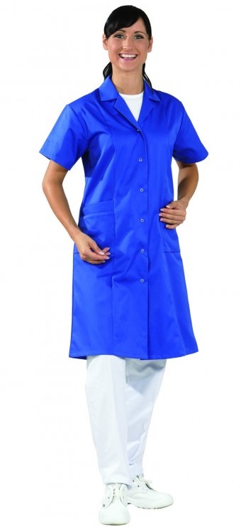 Quarter sleeve, princess shape, 3/4 long, collar with lapel, snap fastener placket, 2 side pockets, back strap.