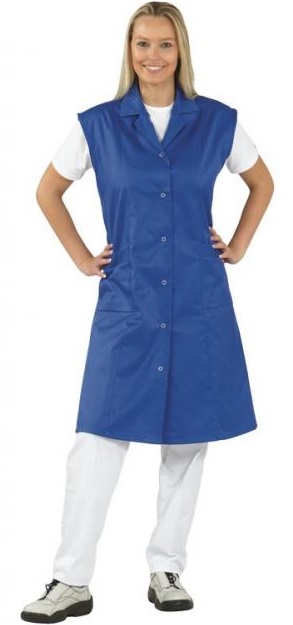 Sleeveless, princess shape, 3/4 long, collar with lapel, press stud placket, 2 side pockets, back strap.