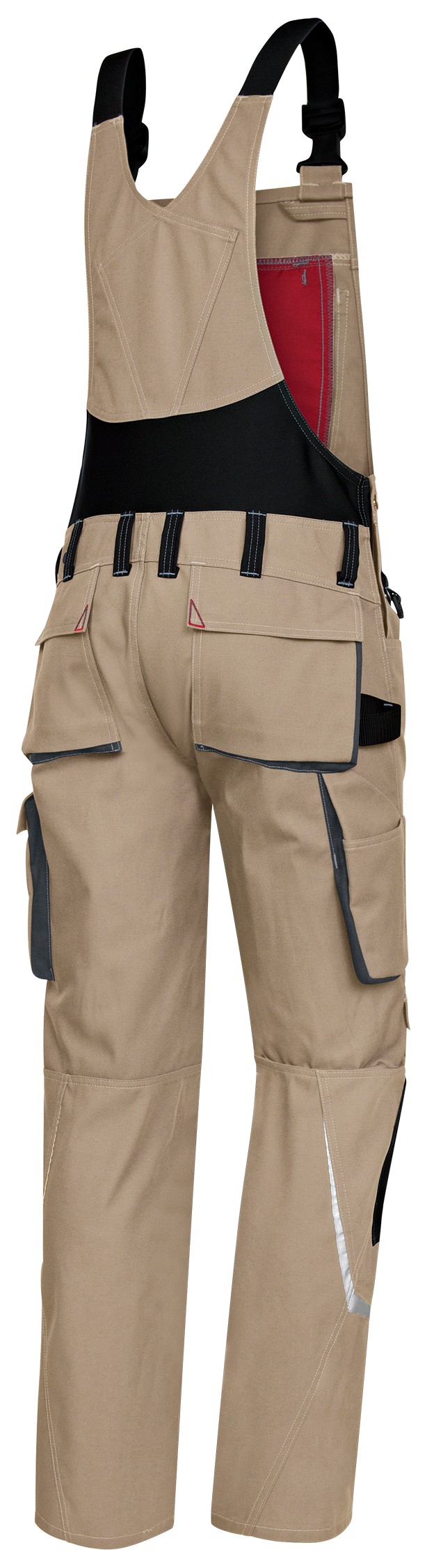 stretch straps with plastic buckles, double bib pocket with zipper and pocket flap, 2 pen pockets, high back with stretch insert for more freedom of movement, adjustable waist size