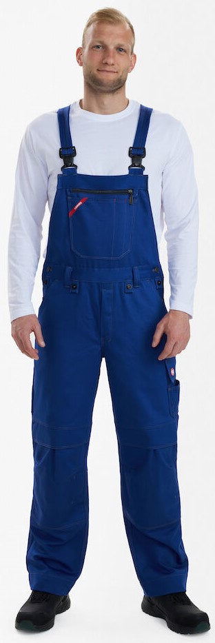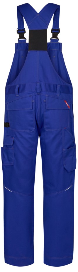 Functional dungarees with contrasting topstitching. High-cut back with wide elasticated waistband and adjustable straps. Chest pocket with compartments for pens and chest pocket with zipper. Optimum fit, ergonomically shaped knees. Adjustable waist size. Two spacious, slanted slit pockets at the front. Two back pockets with flap. Thigh pocket with flap and inserts for pens, for example. Free-hanging, reinforced folding rule pocket with extra compartments guarantees optimum freedom of movement. Adjustable hammer loop. Reinforced knee pocket with two adjustment options for knee pads. Reinforced hem on trouser legs for extra wear resistance. High visibility thanks to reflective piping in the middle of the back of the trouser legs. The trouser legs have an extra wide turn-up so that the inseam can be extended if required. For an extra-long leg length, simply open one hem, which conceals an additional hem.