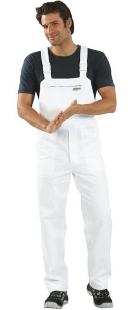 Bib with concealed brass zipper, 2 reinforced front patch pockets, 1 reinforced back pocket, 1 ruler pocket, adjustable side slits with access, buttoned fly, raised back, braces with rubber insert, safety buckles on the straps.