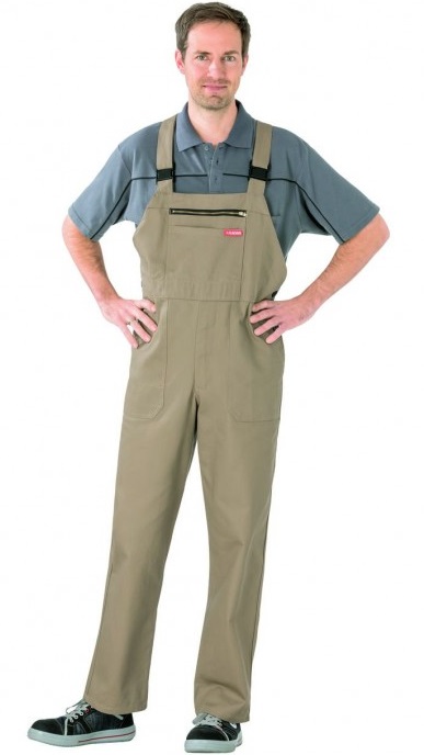 Bib with brass zip, additional patch bib pocket, 2 reinforced patch front pockets, 1 back pocket, 1 ruler pocket, adjustable side slits, fly with zip, raised back with solidly constructed elastic intermediate part, safety buckles on the straps.