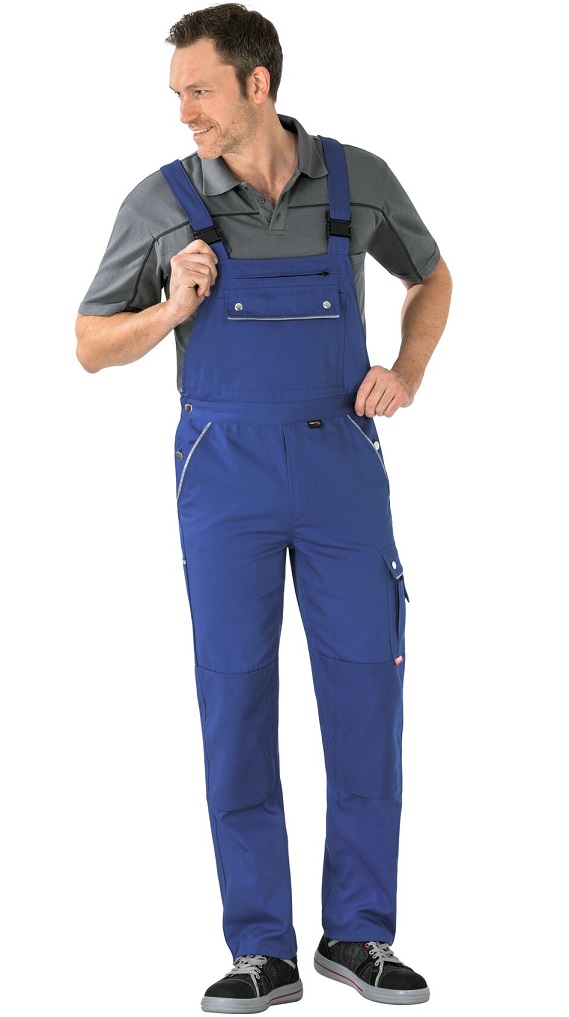 This article, in conjunction with a knee PLANAMpad (Art. No. 9901027), is certified as knee protection according to EN 14404 Type 2, Level 1. Knee pockets made of Cordura®, 2 set-in pouch pockets made of Cordura®, double ruler pocket made of Cordura® on the right, reflective piping on pocket openings and pocket flaps, thigh pocket on the left with flap and press studs, mobile phone pocket on top, double bib pocket, 1 with flap and press studs and 1 with zip, elasticated waistband, 1 reinforced hip pocket on the right, waistband width adjustment with jeans button, zip in trouser fly, raised back with cross straps, straps with elasticated elastic band insert, safety buckle on the straps.