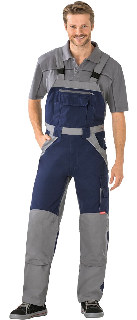 This article, in conjunction with a knee PLANAMpad (Art. No. 9901027), is certified as knee protection according to EN 14404 Type 2, Level 1. 2 set-in pouch pockets, 2 patch knee pockets, double ruler pocket on the right, thigh pocket on the left with flap and Velcro fastener, mobile phone pocket on the left, bib pocket with flap and Velcro fastener, further bib pocket with zip, 2 pen compartments, elasticated waistband, 2 hip pockets with flaps and Velcro fastener, waist width adjustment with jeans button, zipper in trouser fly, raised back with cross straps, straps with elastic elastic band insert, safety buckle on the straps, reflective piping as safety equipment.