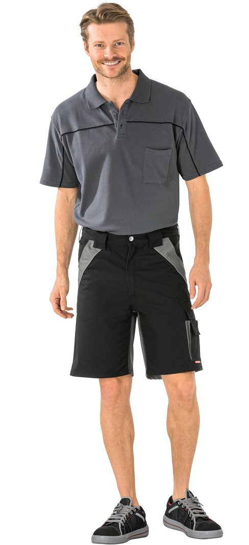 2 set-in pouch pockets, double ruler pocket on the right, thigh pocket on the left with flap and Velcro fastener, mobile phone pocket on the left, elasticated waistband, 2 hip pockets with flap and Velcro fastener, zip in trouser fly, reflective piping as safety equipment.
