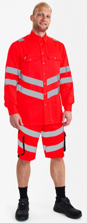 Safety shirt with perforated reflective strips over the shoulders and around the sleeves and torso. Two breast pockets, both with pencil pockets. Clothing class 3.