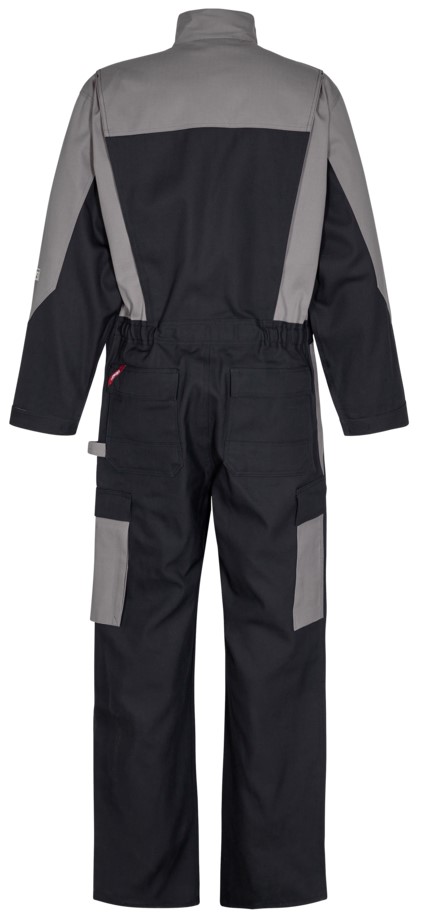 Overall with double button placket and concealed press studs at the front. Chest pockets with flap and Velcro fastening, the right pocket has a cell phone pocket, two inside pockets with zipper, cuffs with Velcro fastening. Back pleats ensure better freedom of movement, two slit pockets concealed with flaps, knee reinforcement/knee pockets with Velcro fastening at the bottom, reinforced back pockets with flaps, hammer loop, folding rule pocket. Functional details on pockets and waistband prevent sparks from catching. Antistatic, flame-retardant and protective against aerosols, spray and light splashes of chemicals.