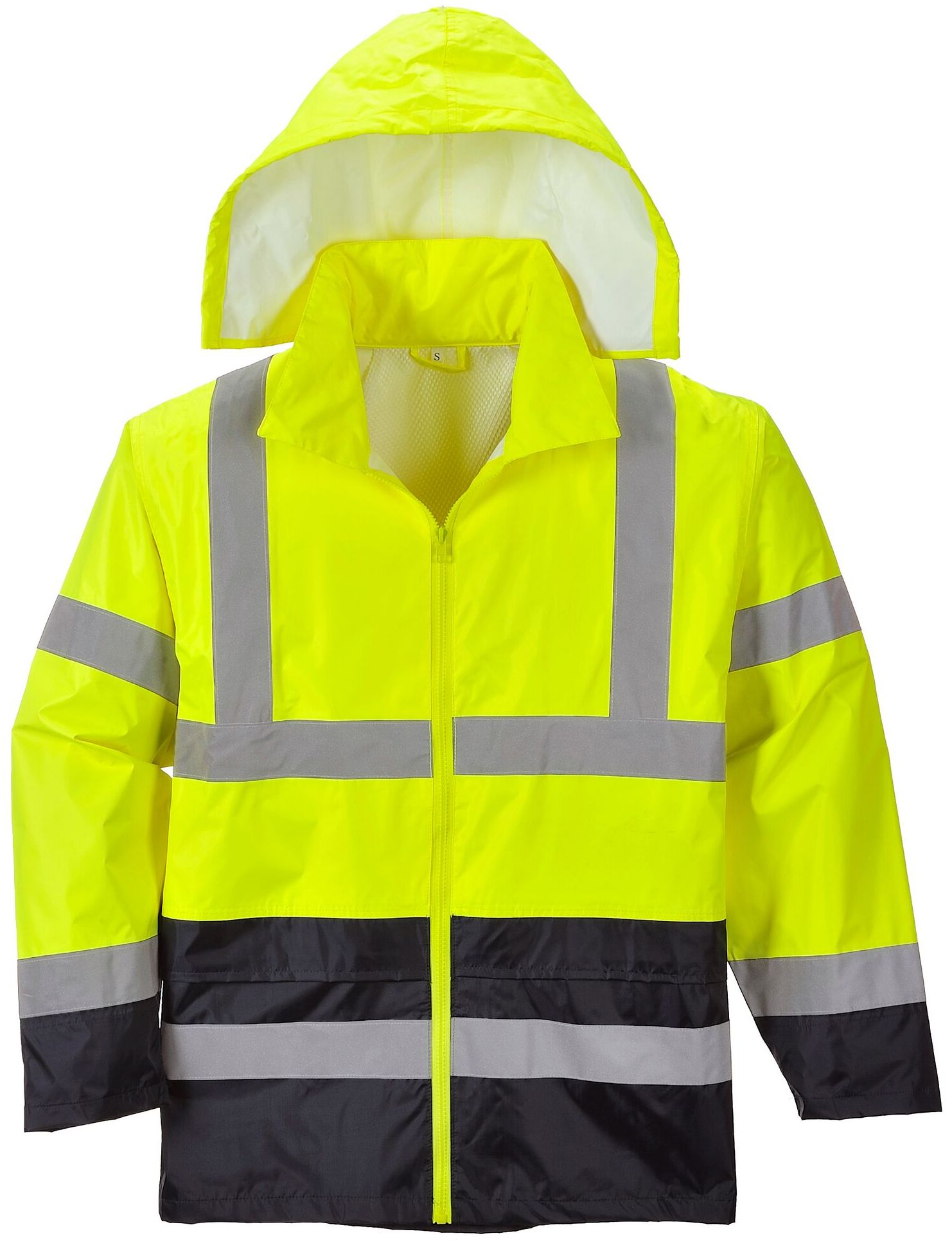 Developed to keep the wearer visible, safe and dry in bad weather. This lightweight, fashionable two-tone jacket features a retractable hood, large pockets for ample storage, ventilated back yoke and ventilation eyelets. 190T EssentialsThis fabric is made from a 190T, 100% polyester yarn in plain weave, therefore it is durable and robust even in harsh conditions. The fabric is lightweight and offers the best abrasion and tear resistance. The PVC coating on the inside makes the fabric waterprooferdiand the water- and dirt-repellent finish on the outside keeps the garment clean for a long time.Warning Protection Our extensive warning protection collection, meets the highest requirements in design and workmanship to ensure that the items comply with the latest standards EN ISO 20471 & ANSI. Innovative and technical, our warning collection is ideal for those who don't compromise on style, comfort, protection and performance.Product features: CE certified Reflective stripes for good visibil