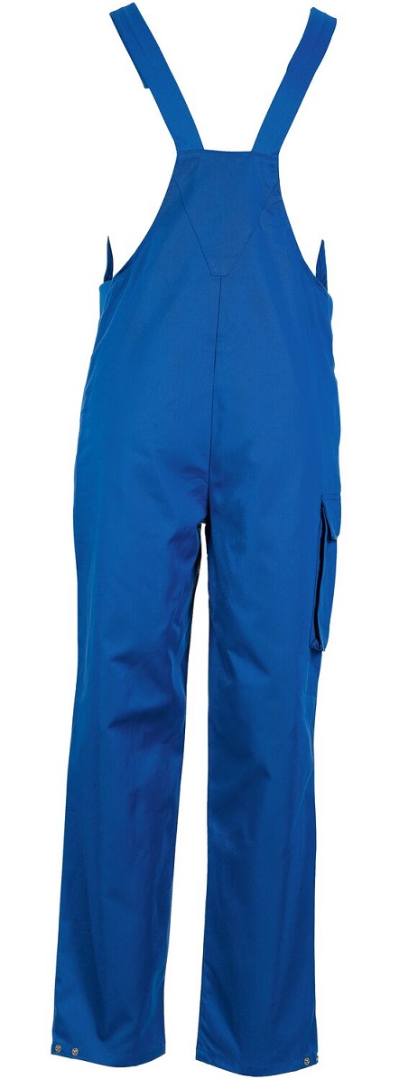 Bib with pocket inside, 2 set-in pouch pockets, to close with flaps and press studs, 1 thigh pocket right with flap and press stud, elastic inserts on the sides, safety buckles on the straps, foot width adjustable with press stud.