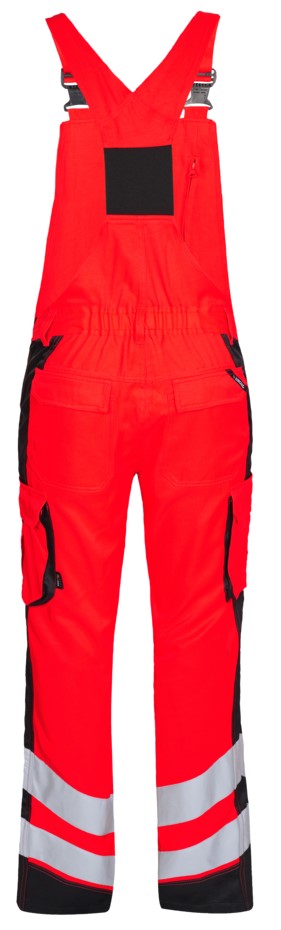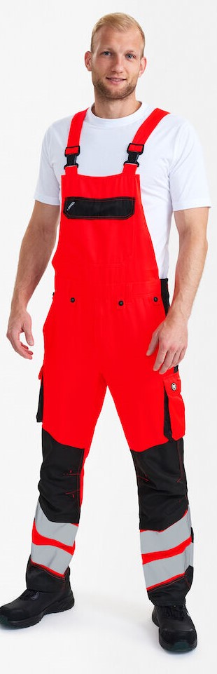 Functional and fluorescent dungarees in a modern design. Optimum fit with ergonomically shaped knee area. The fabric is hard-wearing and breathable and consists of 50% recycled polyester. The elastic waistband at the back ensures a good fit and a secure fit of the dungarees. D-ring on the bib for attaching ID cards, for example. High-cut back and rib-knit inserts at the sides ensure a perfect fit and great comfort. Adjustable straps. Bib pocket with pocket flap and Velcro fastener. The bib pocket has a zipped pocket on the inside. Two thigh pockets with Velcro fastener. The left thigh pocket has an additional cell phone pocket and an inside pocket, e.g. for a walkie-talkie. The right thigh pocket has an inside pocket for a folding rule, for example. Knee reinforcement/knee pocket with Velcro fastener at the bottom and made of CORDURA® material. Reflective stripes on the lower leg. Clothing class 2, tested after 50 washes.