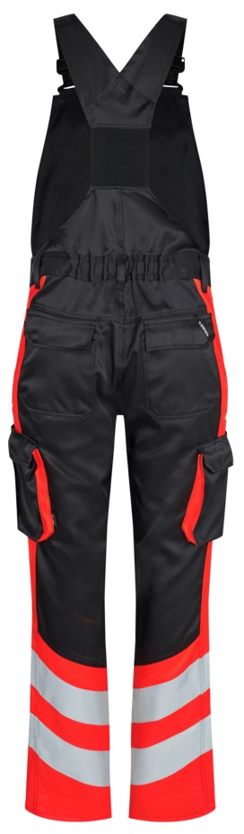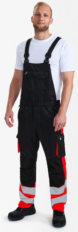 Functional, fluorescent dungarees in a modern design. Optimum fit with ergonomically shaped knee area. The fabric is hard-wearing and breathable and consists of 50% recycled polyester. The elastic waistband at the back ensures a good fit and a secure fit of the dungarees. D-ring on the bib for attaching ID cards, for example. High-cut back and rib-knit inserts at the sides ensure an optimum fit and a high level of comfort. Adjustable straps. Bib pocket with pocket flap and Velcro fastener. The bib pocket has a zipped pocket on the inside. Two thigh pockets with Velcro fastener. The left thigh pocket has an additional cell phone pocket and an inside pocket, e.g. for a walkie-talkie. The right thigh pocket has an inside pocket for a folding rule, for example. Knee reinforcement/knee pocket with Velcro fastener at the bottom and made of CORDURA® material. Reflective stripes on the lower leg. Clothing class 1, tested after 50 washes.