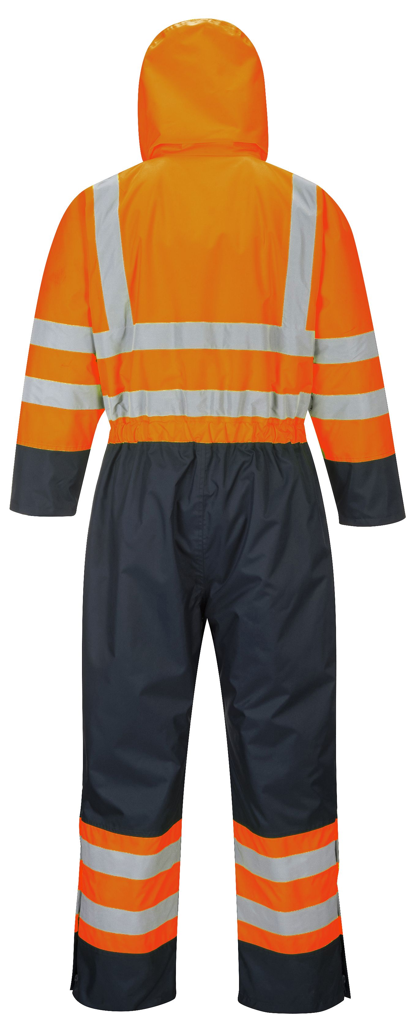 The contrast overall protects the body from wetness and ensures safety at the same time. The padded lining provides extra warmth.300D Industrial warning clothing A collection whose unique pieces can be combined with each other, they are made of a durable fabric certified according to EN343. The collection contains some new, ingenious, innovative articles.	Standards: ANSI/ISEA 107-2015 TYPE R CLASS 3 EN ISO 20471 Class 3 EN 343 Class 3:1 EN 342 (0.420m2 K/W(B), X, 3, 2)	Material: outer fabric: 100% polyester, 300D Oxford fabric with dirt-repellent finish, PU coated 190g lining: 100% polyester 60g filler: 100% polyester 170g 	CE certified	Watererdiwith welded seams prevents water penetration	Reflective stripes for good visibility	Quilted lining for optimum thermal insulation	5 pockets for sufficient storage space	Mobile phone pocket	Elasticated back for a secure fit	Stowable hood for additional functionality	Inner knitted cuff for warmth and comfort	Contrast inserts for dirt protection
