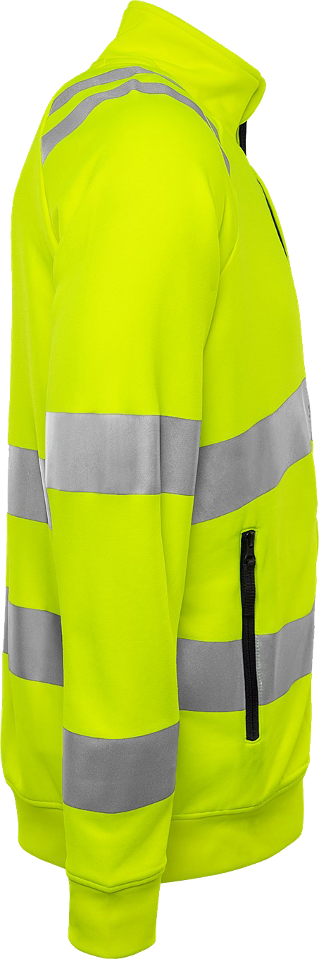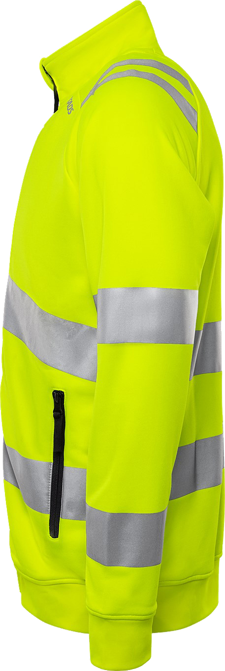 High visibility sweat jacket made from recycled material. Comfortable, soft jacket with zippered pockets and reflective details. Concept: Trofta