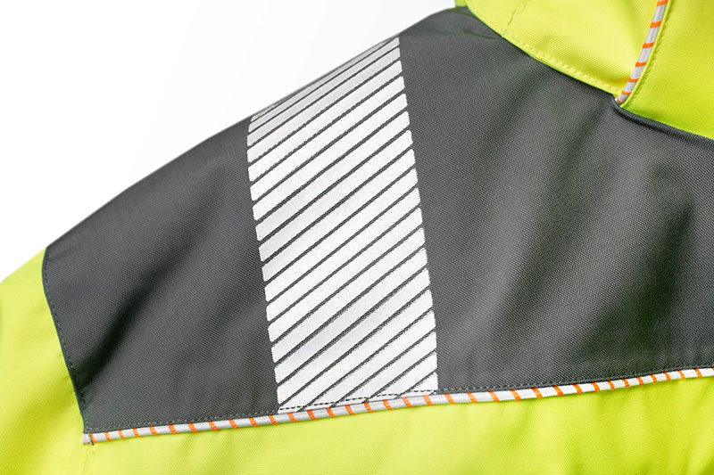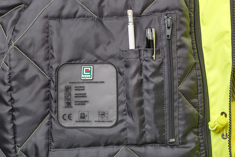 Standard EN ISO 20471 Class 3 EN 343 Class 3/3, EN ISO 13688	Upper 100% polyester, Oxford, highly breathable PU coating	Sizes S-XXXXL	Colour fluorescent yellow, grey contrasted	Breathability 5.000 g/m²/24h	Water column 10.000 mm	Reinforcement 100% polyamide, (Cordura®)	Lining 100% polyester	Padding 100% polyester	 high quality and efficient jacket	 wind and watererdi, highly breathable	 Welded seams	 thermofixed reflective strips, thus no additional seams	 Reflective strip made of 3MScotchlite 5510 Reflective material	 robust Oxford fabric: oil- and dirt-repellent, highly abrasion- and tear-resistant	 Cordura® inserts on sleeves, shoulder and hem ensure long durability	 concealed 2-way YKK® front zip with Velcro fasteners	 removable, warming quilted lining with knitted cuffs at the cuffs	 modern and ergonomic fit	 Movement folds in the back	 Forearm ventilation with zippers	 adjustable waist, hem and sleeve hem	 detachable storm hood with fleece lining	 easy emblem application due