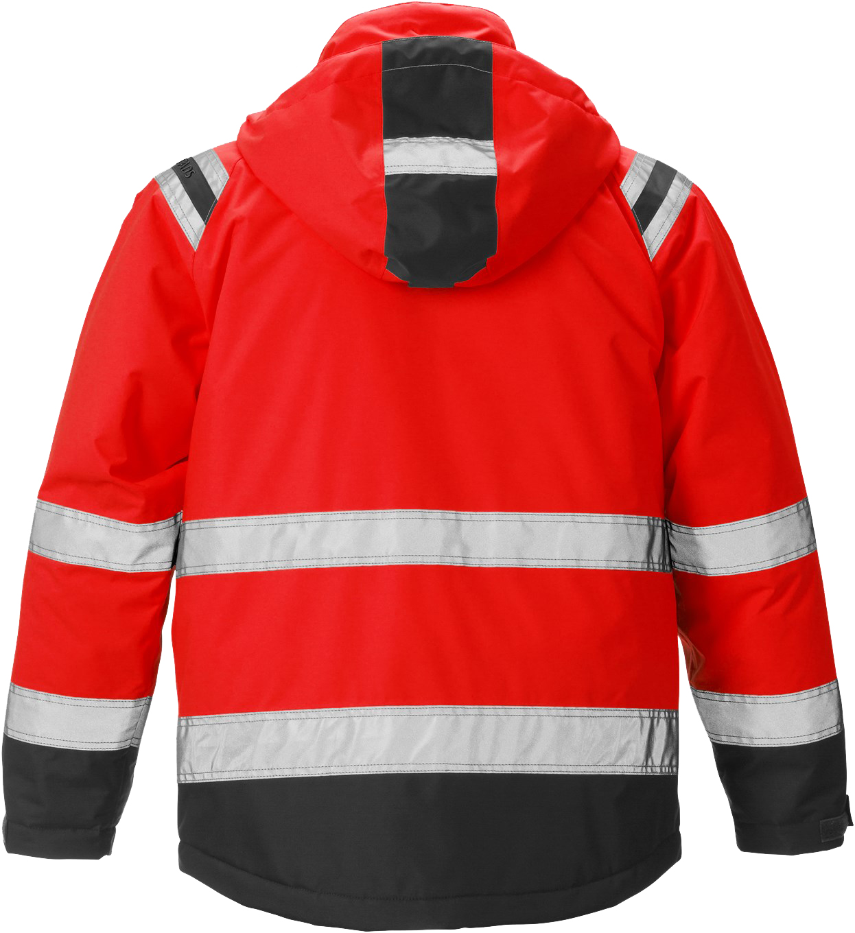 Reflective details on shoulders, Concealed zip with press stud placket to top of collar