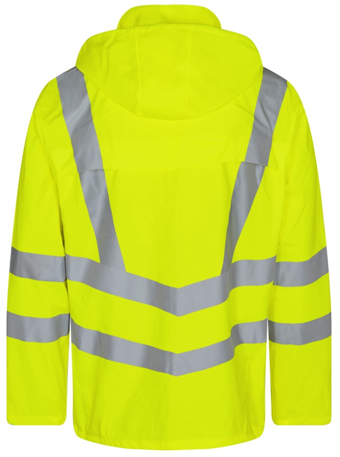 Functional rain jacket with taped seams and ventilation at the back. Zipper and Velcro fastener at the front. Two spacious and functional side pockets and large inside pockets. Detachable, adjustable hood with space for a work helmet. Possibility to adjust the sleeves. Clothing class 3, tested after 5 washes