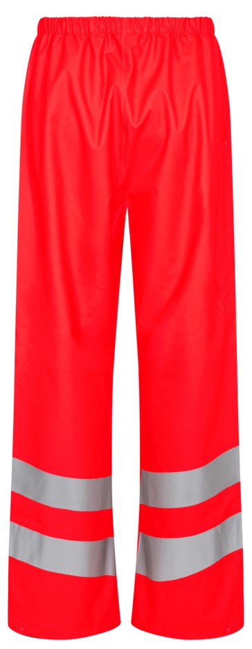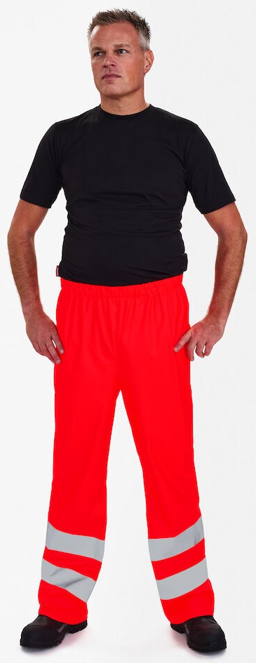Functional rain trousers with taped seams. Adjustable elasticated waist. Functional folding rule pocket. Adjustable leg width at the cuffs. Clothing class 2, tested after 5 washes