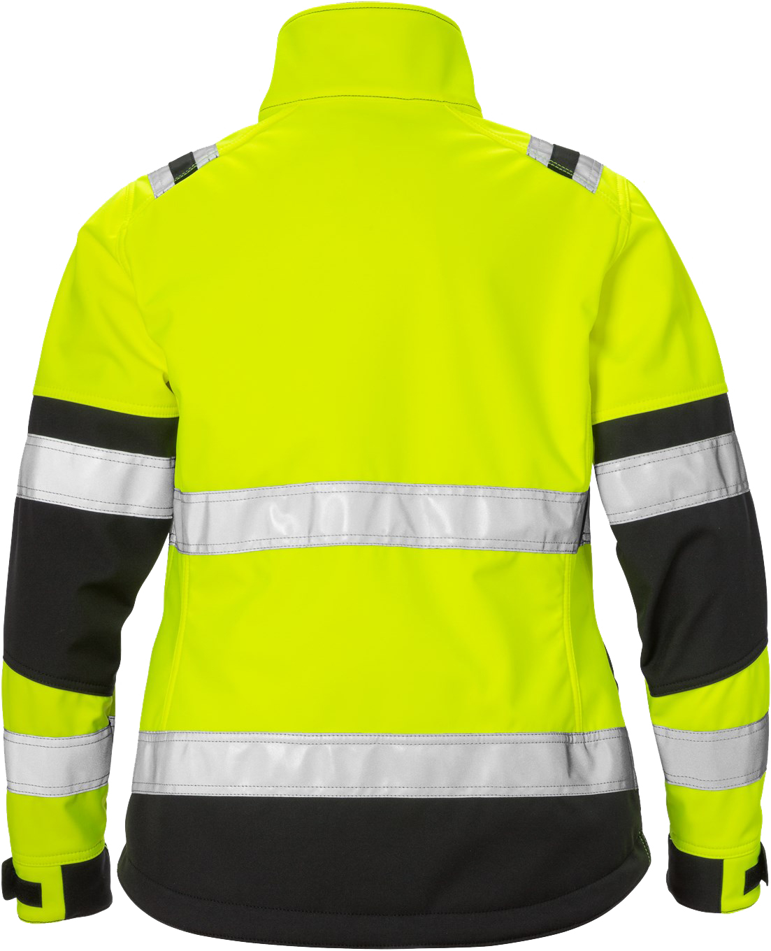 Modern two-tone high visibility jacket for women made of robust and stretchy softshell material for protection against wind and rain, with functional pocket solutions.