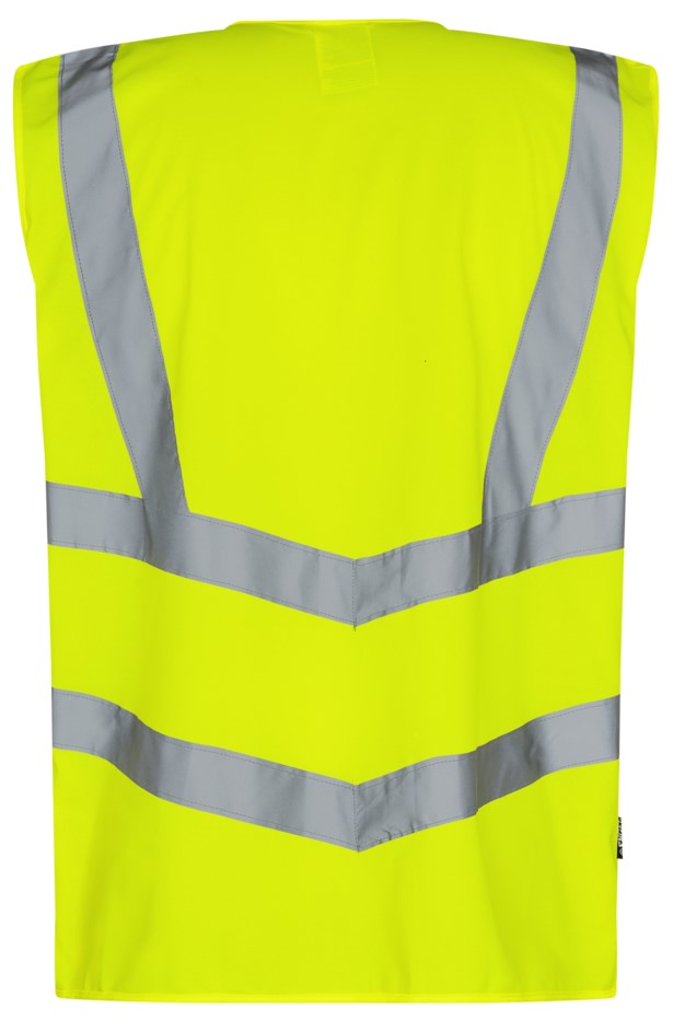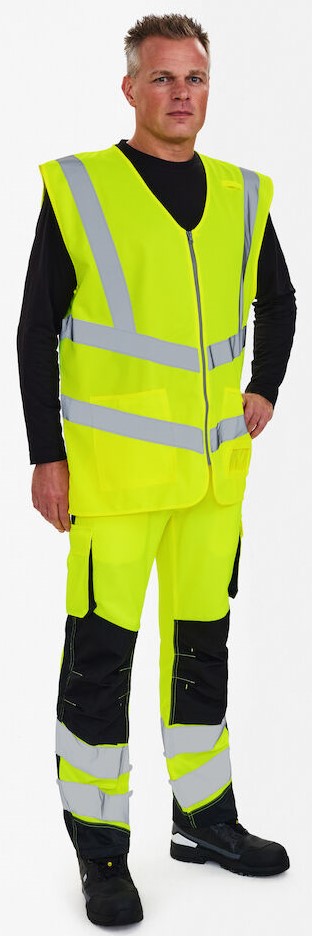 Lightweight, comfortable traffic vest with front zipper. Two large outer pockets with Velcro fastener. ID card holder on the left pocket. Loop, e.g. for walkie-talkie or gas detector, on the left side of the chest. Reflective stripes on the torso and over the shoulders. Clothing class 2, tested after 25 washes.