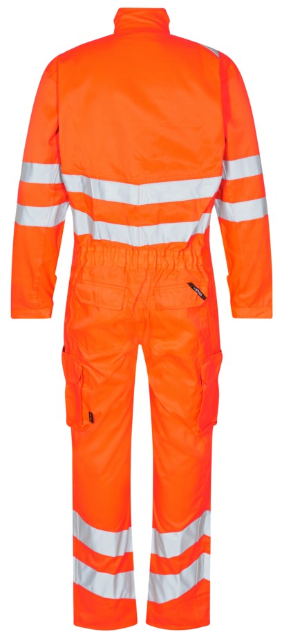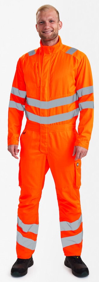 Functional fluorescent combination in a modern design. Optimum fit with ergonomically shaped knee area. Concealed two-way zipper at the front. The fabric is hard-wearing and breathable and consists of 50% recycled polyester. The elastic waistband at the back ensures a good fit and a secure fit of the combination. Adjustable cuffs. Chest pocket with zipper on the right side. Two spacious slanted pockets, each with slit pockets that allow access to the trousers worn underneath. Two thigh pockets with Velcro fasteners. The left thigh pocket has an additional cell phone pocket and an inside pocket, e.g. for a walkie-talkie. The right thigh pocket has an inside pocket for a folding rule, for example. D-ring for attaching ID cards, for example. Knee reinforcement/knee pocket with Velcro fastener at the bottom and made of CORDURA® material. Reflective stripes on shoulders, waist and trouser leg ends. Clothing class 3, tested after 50 washes.
